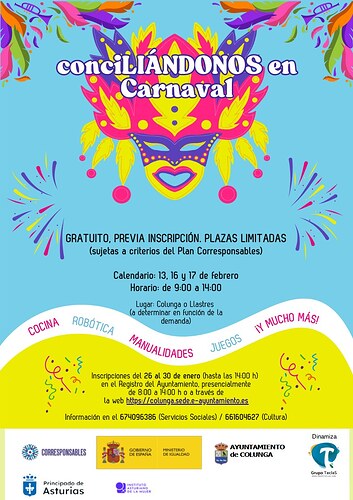 Inscripciones del 26 al 30 de enero (hasta las 14h) en el Registro del Ayuntamiento, presencialmente de 8:00 a 14:00 h o a través de la web: https://colunga.sede.e-ayuntamiento.es/