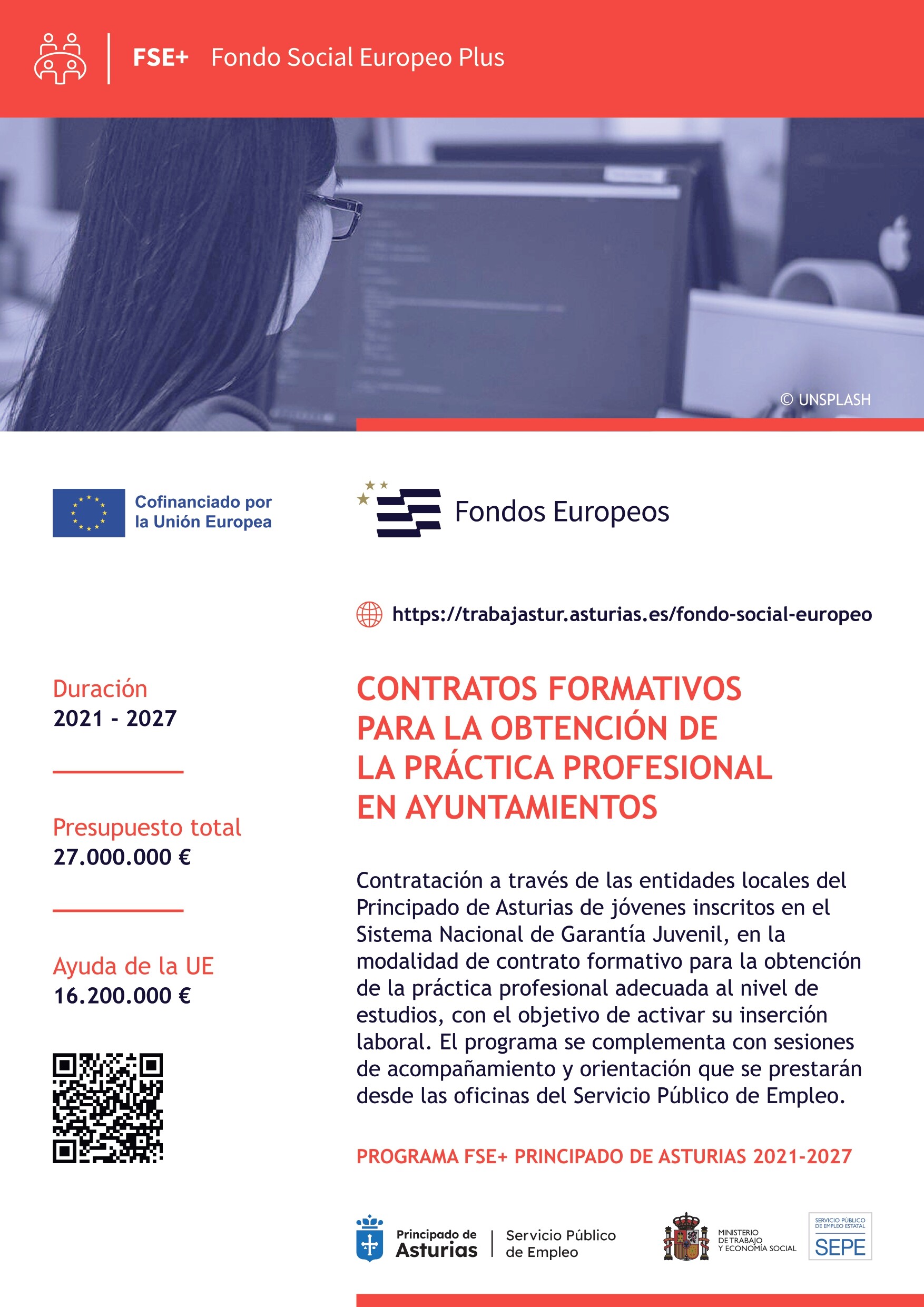 Las contrataciones son objeto de financiación por el Servicio Público de Empleo del Principado de Asturias y por el Servicio Público de Empleo Estatal. Además, es objeto de cofinanciación al amparo del Fondo Social Europeo a través del Programa FSE+ 2021-2027.