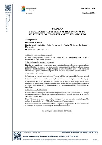 Nueva apertura del plazo de presentación de solicitudes contrato formativo de jardinero/a