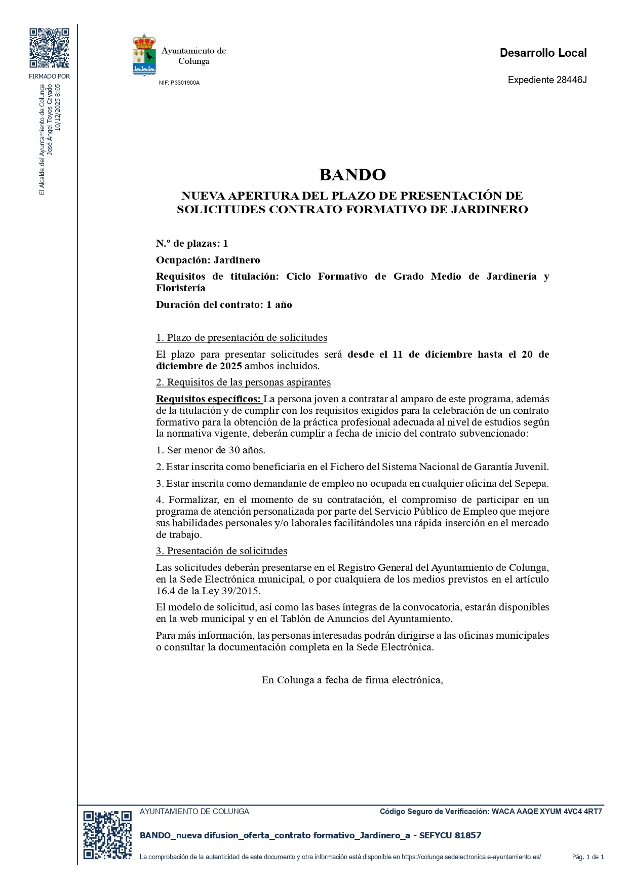 Plazo de presentación de solicitudes: el plazo para presentar solicitudes será desde el 11 de diciembre hasta el 20 de diciembre de 2025 ambos incluidos.