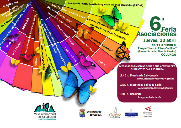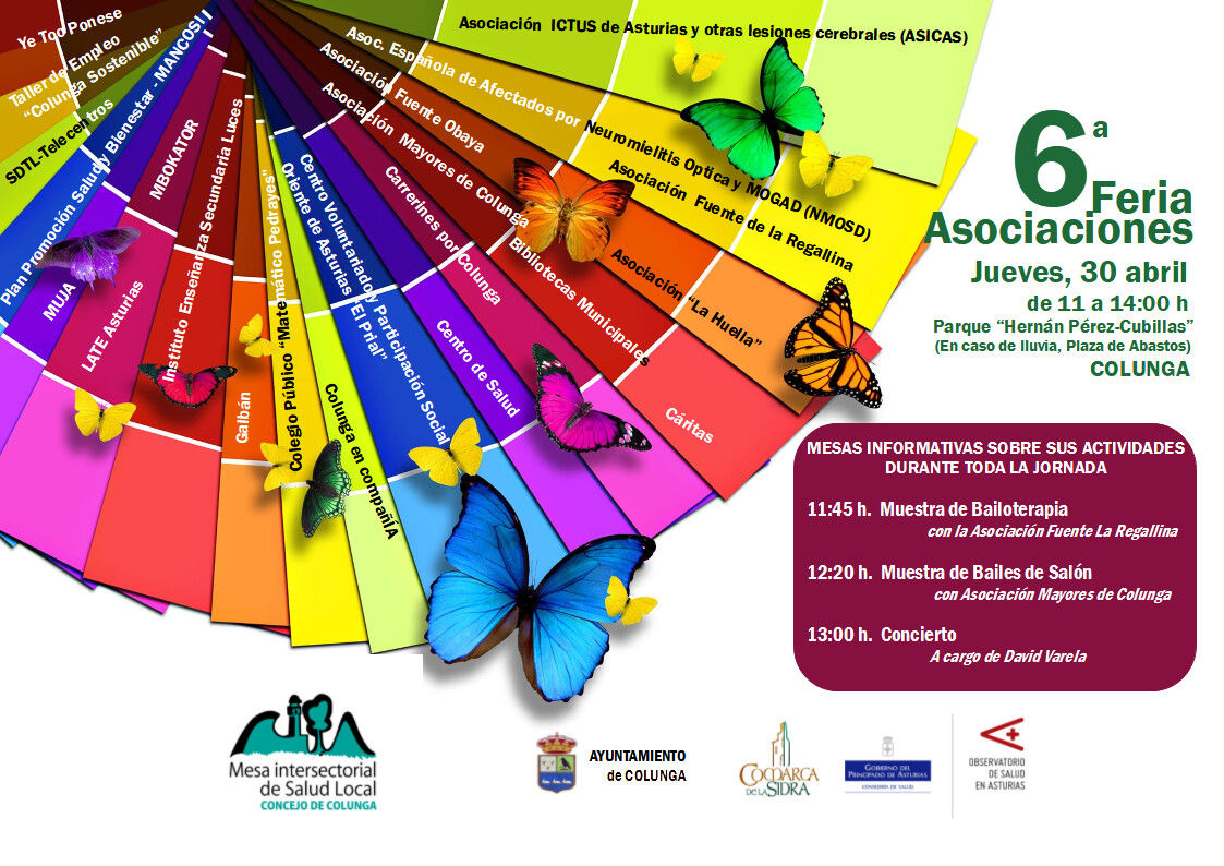 El próximo jueves 30 de abril el Parque “Hernán Pérez-Cubillas” de Colunga (junto a la Oficina de Turismo) acogerá la 6ª edición de la feria de Asociaciones, una iniciativa surgida de la Mesa Intersectorial de Salud Local (MIS) que sirve como escaparate de las asociaciones y entidades que integran la MIS y otras entidades que, a nivel ya regional, forman parte del sector de la salud y el bienestar social.
