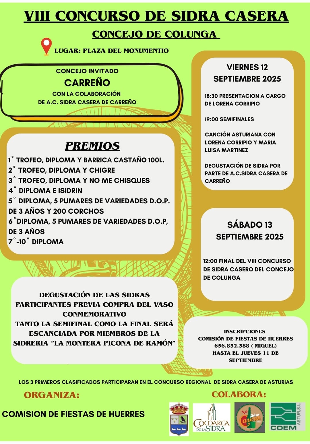 Inscripciones Comisión de Fiestas de Huerres 656.832.388 (Miguel) hasta el jueves 11 de septiembre